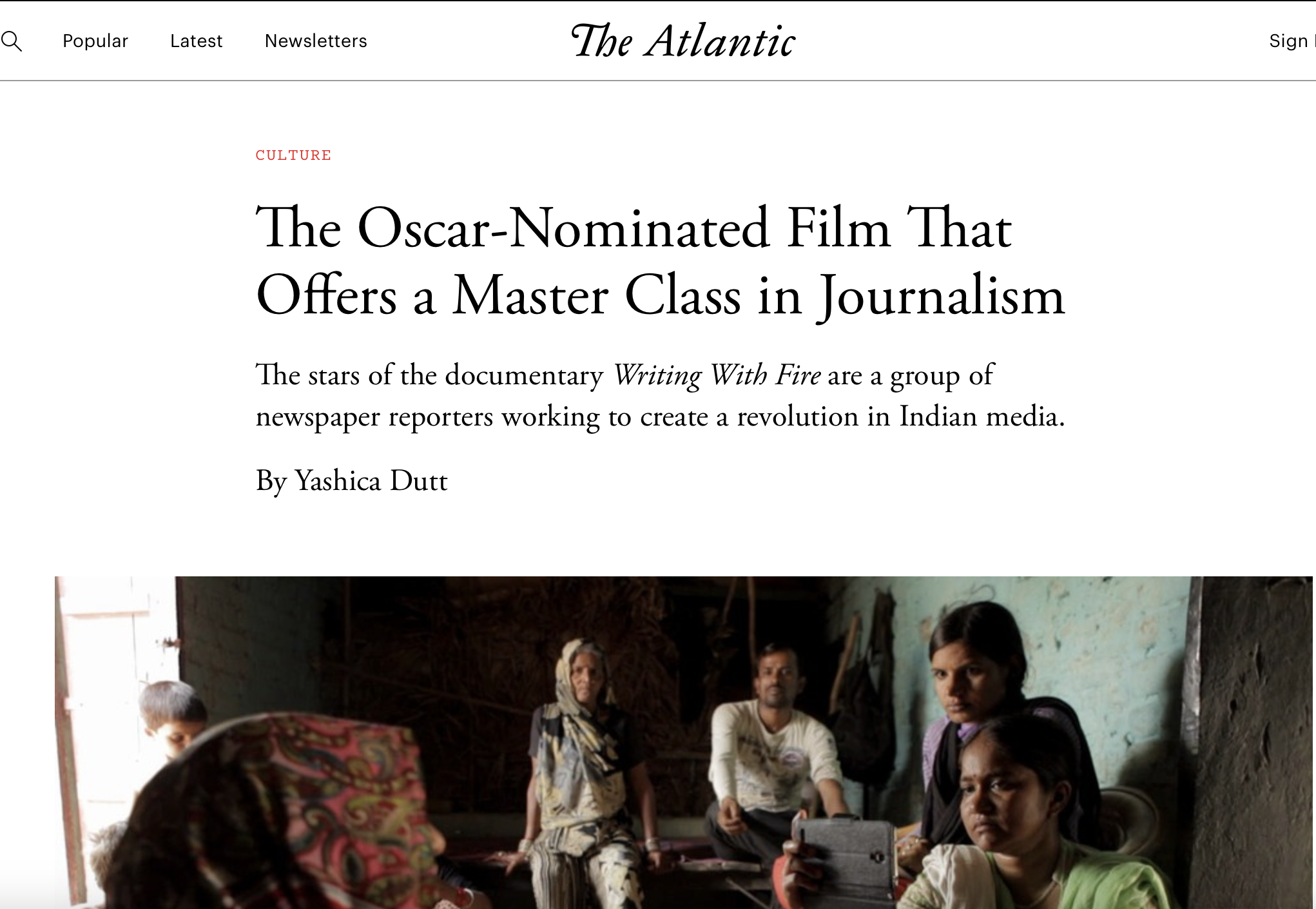 Essay in The Atlantic on Writing with Fire, the Oscar Nominated Documentary on India’s Dalit owned media outlet Khabar Lahariya; February 14, 2022.